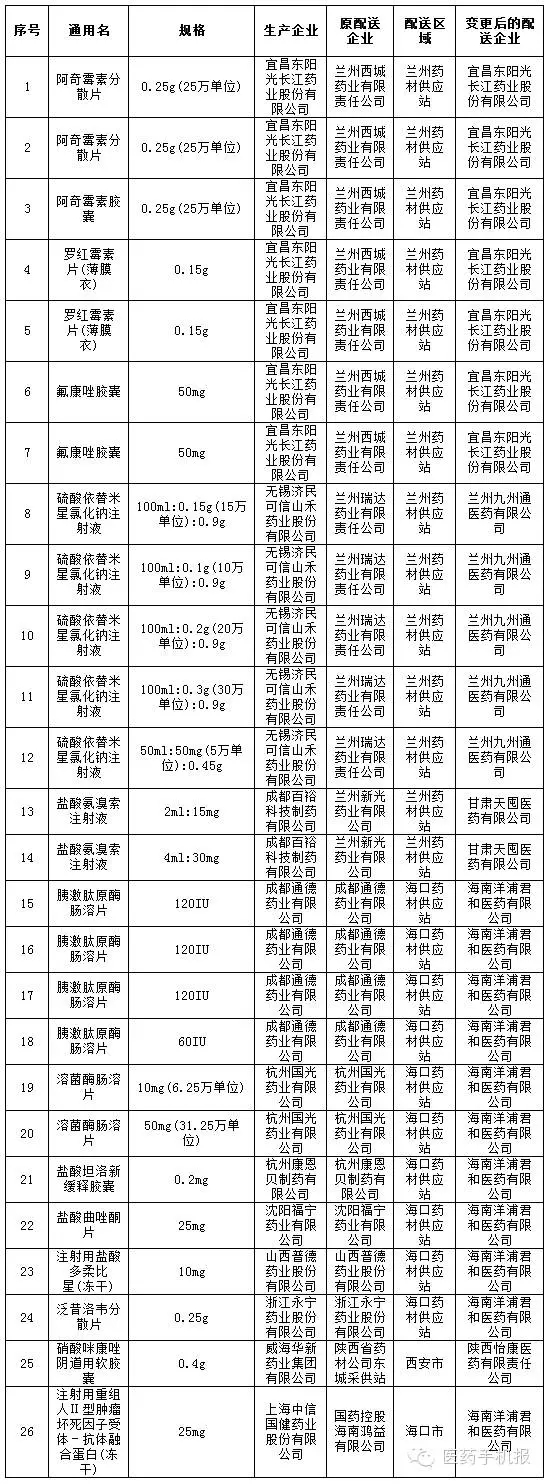 今日,全軍藥材供應(yīng)保障監(jiān)管中心發(fā)布《關(guān)于調(diào)整中選產(chǎn)品配送企業(yè)相關(guān)信息的通知》,批準11個生產(chǎn)企業(yè)的26個中選品規(guī)的配送企業(yè)進行變更。