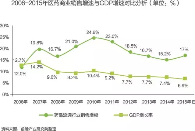 對比醫(yī)藥商業(yè)增速度與GDP增速可以看出,藥品商業(yè)的增長速度與GDP增速呈一定程度的正相關,經(jīng)濟增長較快的年份也是藥品流通行業(yè)銷售增幅較大的年份;但由于人們?nèi)找骊P注健康,藥品作為生活必需品的地位日益鞏固,近年來兩者的關聯(lián)程度越來越低。