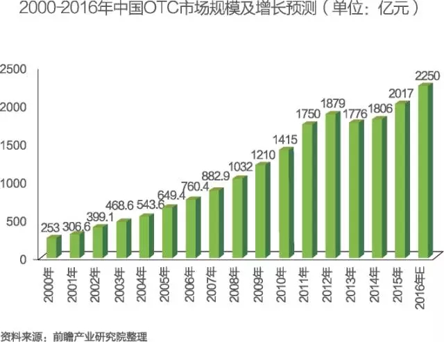 2015年我國OTC市場規(guī)模超過2000億元。預計到2016年,我國OTC市場規(guī)模將達到2250億元,到2020年我國OTC市場規(guī)模將位居世界第一。