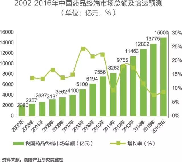 2015年醫(yī)藥終端市場總體規(guī)模13775億元(按零售價計算,下同),同比僅增長7.6%,增速比2014年大幅下降5.6個百分點,創(chuàng)近十年來歷史新低。