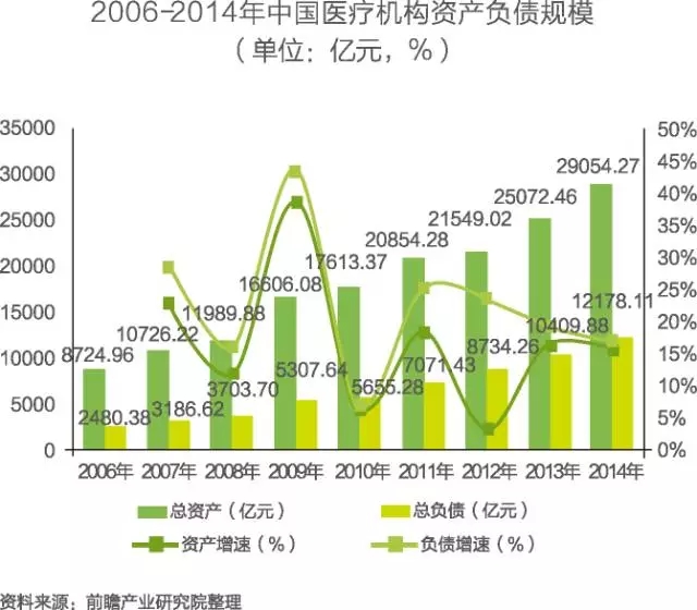 2006-2014年,我國醫(yī)療機構(gòu)資產(chǎn)和負債規(guī)模均不斷增加,2014年分別達到2.91萬億元和1.22萬億元,分別較上年同期增長15.88%和17%。總體而言,我國醫(yī)療機構(gòu)資本積累速度較快,資本保全性以及應付風險能力較強。