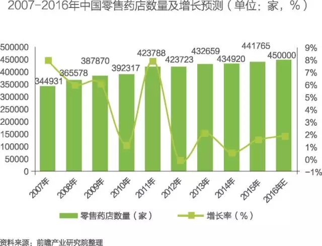 據(jù)國家食品藥品監(jiān)督管理總局資料顯示,截至2014年底,我國藥店總數(shù)(包括所有連鎖門店和單體藥店)為434920家,比2013年嗇了2261家,同比增長0.52%,增速有所放緩。