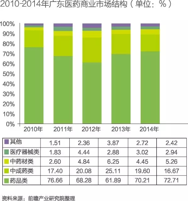 2014年,廣東醫(yī)藥商業(yè)市場中,藥品類占72.71%,中成藥、中藥材、醫(yī)療器械分別占16.67%、5.26%、2.94%。