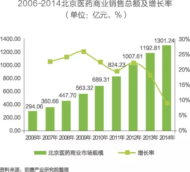 北京目前約有240余家醫(yī)藥商業(yè)企業(yè),擁有200多家公立醫(yī)院。2006-2014北京市醫(yī)藥商業(yè)銷售增長率均在9%以上;2014年銷售額為1301.24億元,同比增長9.09%。近兩年來銷售增長率有所下降。