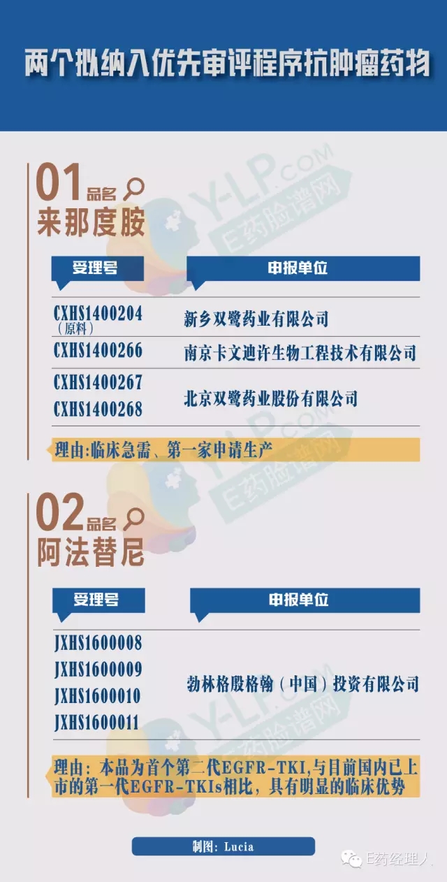 4月24日,國家食品藥品監(jiān)督管理總局藥品審評中心(CDE)發(fā)布公告:根據(jù)CFDA《關(guān)于解決藥品注冊申請積壓實(shí)行優(yōu)先審評審批的意見》,CDE于2016年4月20日組織專家,按照《藥品審評中心優(yōu)先審評工作程序(試行)》,對申請優(yōu)先審評的用于抗腫瘤適應(yīng)證的藥品注冊申請進(jìn)行了審核論證。兩個(gè)注冊申請的品種為臨床急需或與我國現(xiàn)有治療藥品比較具有明顯的臨床優(yōu)勢,擬納入優(yōu)先審評程序:雙鷺?biāo)帢I(yè)的來那度胺和勃林格殷格翰的阿法替尼。