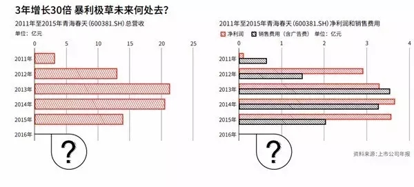 青海春天的蟲草銷售神跡背后,是青海當?shù)卣拇罅ν苿樱约百Y本市場的盲目助攻,加上運用類似腦白金、哈藥狂轟亂炸式的廣告營銷,短期快速拉動銷量。“極草”身份一直在地方和國家食藥監(jiān)管部門的博弈之下,游走于食品、中藥飲片或保健品之間,最終難逃“叫停門”。如若重組無望,等待青海春天的必是市值崩塌,存貨高居的旗下600余家直營店和經(jīng)銷商也難逃厄運。