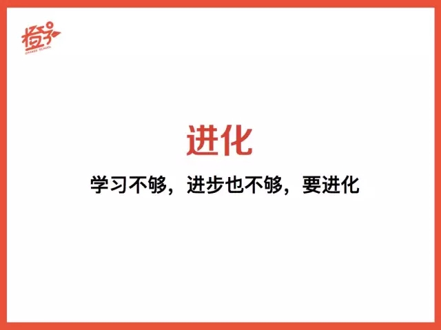 我覺得可能橙子學(xué)院要做的事情,不僅僅是進(jìn)步,而是進(jìn)化。我們不僅要做加法,還要做減法——我們要超越我們現(xiàn)在的一些習(xí)性。