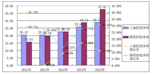 從凈利潤看,國藥控股從落后到反超,2011年凈利潤15.61億元,落后上海醫(yī)藥4.81億元,2015年凈利潤37.61億元,超過上海醫(yī)藥8.94億元。從增速看,國藥控股增長更快,過去4年增速都領(lǐng)先上海醫(yī)藥。