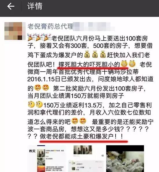 迅速暴富的成功學,讓“老倪膏藥”成了朋友圈里最狂熱的生意。老倪團隊成員發(fā)布的廣告自稱,2015年,“老倪膏藥”全國微商代理已超10萬人,營業(yè)額突破40億元。