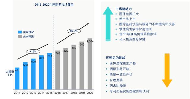基于目前可預(yù)見的各種挑戰(zhàn),IMS Health對于中國醫(yī)藥市場的未來幾年增長預(yù)測趨于謹(jǐn)慎:預(yù)計2016至2020年中國醫(yī)藥市場將增長6.9%。
