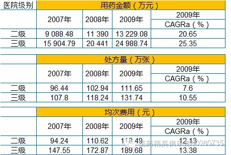 統(tǒng)計(jì)各種抗菌藥物的用藥金額,按用藥金額進(jìn)行排序,并計(jì)算2009年相應(yīng)品種用藥金額的CAGR。用藥金額居前10位的抗菌藥物見表3。
