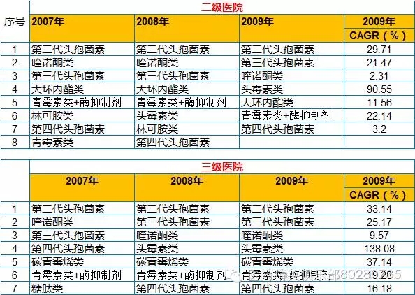 統(tǒng)計(jì)各類抗菌藥物的用藥金額,按用藥金額進(jìn)行排序。用藥金額居前10位的抗菌藥物類別見表2,計(jì)算2009年相應(yīng)類別用藥金額的CAGR。