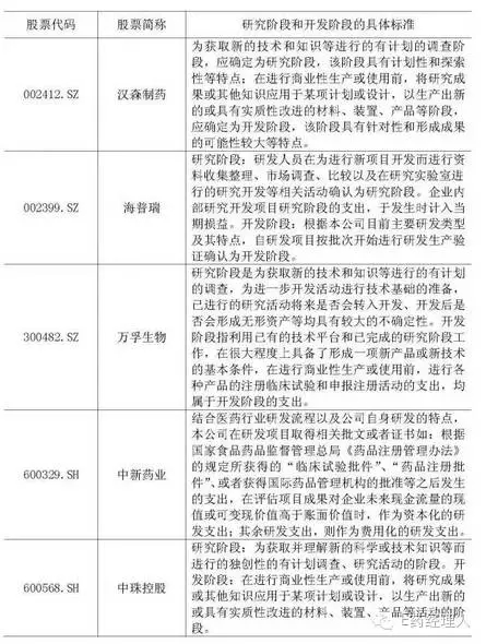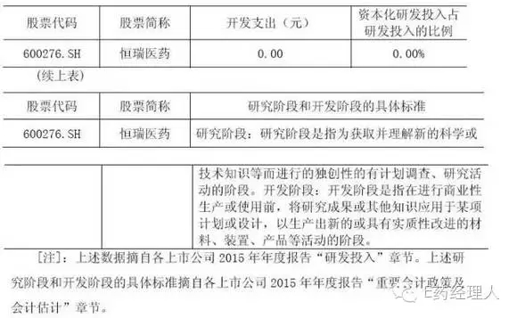 2015年度同行業(yè)上市公司恒瑞醫(yī)藥的資本化研發(fā)投入占研發(fā)投入的比例及相應(yīng)研究階段和開發(fā)階段的具體標(biāo)準(zhǔn)情況如下: