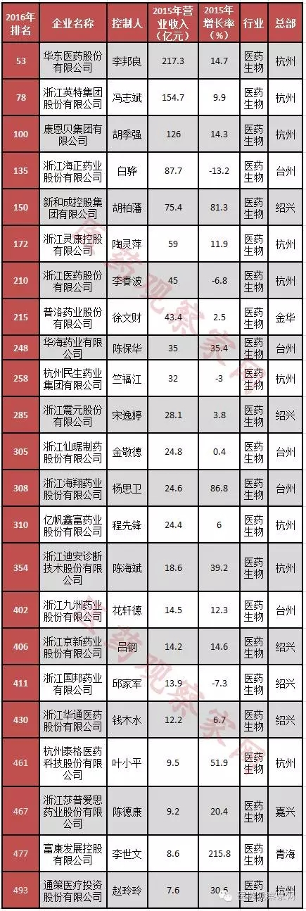 導(dǎo)讀日前,浙商雜志發(fā)布2016浙商全國(guó)500強(qiáng),據(jù)了解,這是《浙商》雜志第八次推出該榜單。據(jù)醫(yī)藥觀察家網(wǎng)不完全統(tǒng)計(jì),醫(yī)藥生物行業(yè)共有23家企業(yè)榜上有名, 排名第一的是華東醫(yī)藥股份有限公司,其2015年?duì)I業(yè)收入是217.3億元,總榜單的53名,同時(shí)也是醫(yī)藥生物行業(yè)唯一一家營(yíng)收超過200億元的藥企。 第二名是浙江英特集團(tuán)股份有限公司,其2015年?duì)I收是154.7億元,總排名78; 第三名是康恩貝集團(tuán)有限公司,其其2015年?duì)I收是126.0億元,總排名100; 上述三家企業(yè)是進(jìn)入100強(qiáng)的藥企,同時(shí)也是營(yíng)收超100億元的企業(yè)。 值得一提的是,今年有三家新上榜藥企,分別為杭州泰格醫(yī)藥科技股份有限公司、富康發(fā)展控股有限公司、通策醫(yī)療投資股份有限公司。 (注:本表格為手動(dòng)輸入,如有疏漏,歡迎指出) 信息來源:醫(yī)藥觀察家網(wǎng)