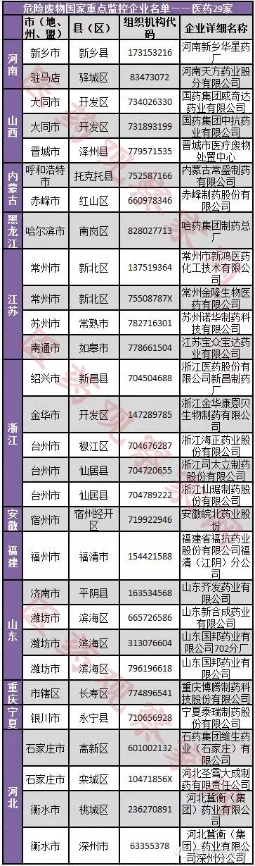 導讀124家藥企在環(huán)境保護部2016年國家重點監(jiān)控企業(yè)名單中榜上有名!環(huán)境保護部今年發(fā)布2016年國家重點監(jiān)控企業(yè)名單,其中廢水排放企業(yè)2660家、廢氣排放企業(yè)3281家、污水處理廠3812家、規(guī)?;笄蒺B(yǎng)殖場(小區(qū))21家、重金屬企業(yè) 2901家、危險廢物企業(yè)1637家。 據醫(yī)藥觀察家網不完全統(tǒng)計,共有124家藥企榜上有名,其中廢水國家重點監(jiān)控企業(yè)有87家、廢氣國家重點監(jiān)控企業(yè)有8家、危險廢物國家重點監(jiān)控企業(yè)有29家。污水處理廠、規(guī)?;笄蒺B(yǎng)殖場(小區(qū))、重金屬企業(yè)三個名單中未發(fā)現有藥企。 在廢水國家重點監(jiān)控企業(yè)醫(yī)藥板塊中,湖北為重點監(jiān)控藥企最多的省份,共有14家,包括湖北丹澳藥業(yè)有限公司、宜昌三峽制藥有限公司(一廠)、華中藥業(yè)股份有限公司、湖北諾克特藥業(yè)有限公司、湖北省宏源藥業(yè)有限公司、湖北廣濟藥業(yè)股份有限公司等。 其次為江西9家,包括江西國藥有限責任公司、江西躍華藥業(yè)有限公司、江西富祥藥業(yè)股份有限公司、江西珍視明藥業(yè)有限公司等; 河北7家,包括河北圣雪大成制藥有限責任公司、神威藥業(yè)集團有限公司、石藥集團新諾威制藥股份有限公司、河北興柏藥業(yè)集團有限公司等。 信息來源:醫(yī)藥觀察家網