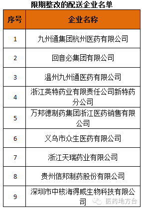 二、限期整改。因企業(yè)訂單操作不規(guī)范、配送不及時以及區(qū)域選擇性供貨等原因,造成配送率未達(dá)標(biāo),給予九州通集團(tuán)杭州醫(yī)藥有限公司等9家企業(yè)限期整改的處理。整改期限為6月16日至7月15日,后期我中心將根據(jù)期限內(nèi)整改情況做進(jìn)一步處理。