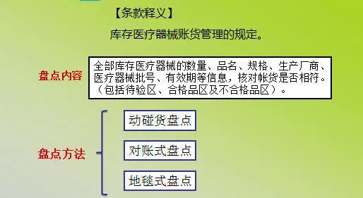 第六章 入庫、貯存與檢查 第四十六條 企業(yè)應(yīng)當(dāng)對庫存醫(yī)療器械定期進行盤點,做到賬、貨相符。 【條款釋義】
