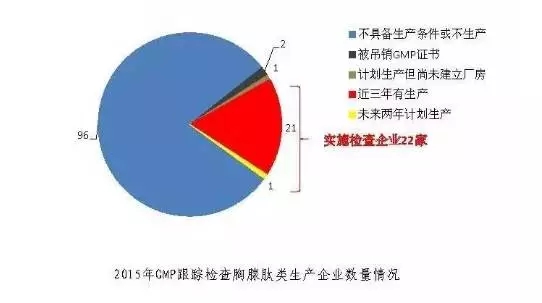 121家胸腺肽類藥品生產(chǎn)企業(yè)中,停產(chǎn)或不具備生產(chǎn)條件99家,實(shí)際共對22家企業(yè)實(shí)施了藥品GMP跟蹤檢查。