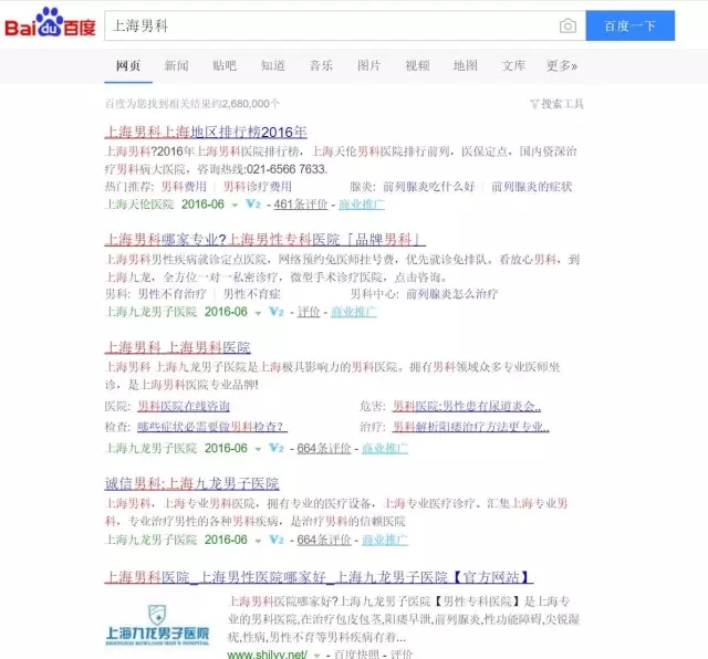 通過百度搜索了“上?!焙汀澳锌啤钡汝P(guān)鍵詞,得到的結(jié)果中均有被標(biāo)注為“商業(yè)推廣”的醫(yī)院信息置于搜索結(jié)果頂部,說明百度在資本面前“言出必行”——“隨著公司通過調(diào)整經(jīng)營方式來適應(yīng)新的監(jiān)管規(guī)范,他們有望借助‘高品質(zhì)’醫(yī)療客戶逐步恢復(fù)業(yè)務(wù)?!?/span>