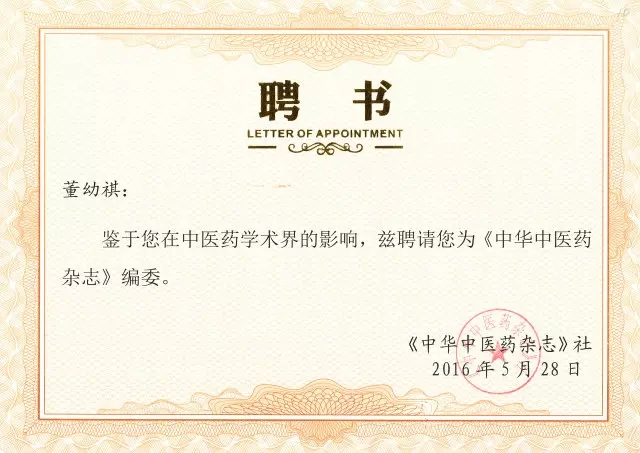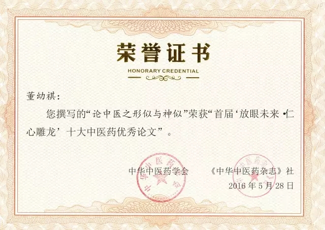 近日,董幼祺教授與遼寧中醫(yī)藥大學(xué)校長楊關(guān)林教授、原浙江中醫(yī)藥大學(xué)校長范永升教授、北京中醫(yī)藥大學(xué)副校長喬延江教授等一起受聘為《中華中醫(yī)藥雜志》編委,其撰寫的《論中醫(yī)之形似與神似》論文榮獲由中華中醫(yī)藥學(xué)會、《中華中醫(yī)藥雜志》社主辦,中國科協(xié)項(xiàng)目資助的首屆“放眼未來·仁心雕龍”論文評選活動的十大中醫(yī)藥優(yōu)秀述評論文獎(jiǎng)。《中華中醫(yī)藥雜志》是中華中醫(yī)藥學(xué)會主辦的國家級高級中醫(yī)藥學(xué)術(shù)期刊,是中醫(yī)藥學(xué)科中的權(quán)威雜志。