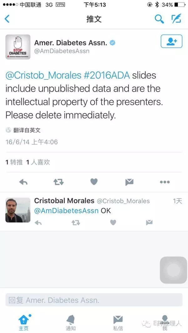 “2016美國(guó)糖尿病協(xié)會(huì)會(huì)議的幻燈片包括未發(fā)表的數(shù)據(jù),演示者擁有該數(shù)據(jù)的知識(shí)產(chǎn)權(quán)。請(qǐng)立即刪除?!泵绹?guó)糖尿病協(xié)會(huì)的官方Twitter賬號(hào)寫道。