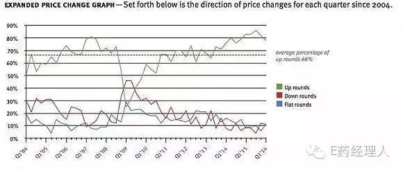 Fenwick&West律所對(duì)自2004年第一季度來(lái)融資情況作出統(tǒng)計(jì),綠色代表上升輪公司所占比例,紅色代表下降輪公司所占比例。