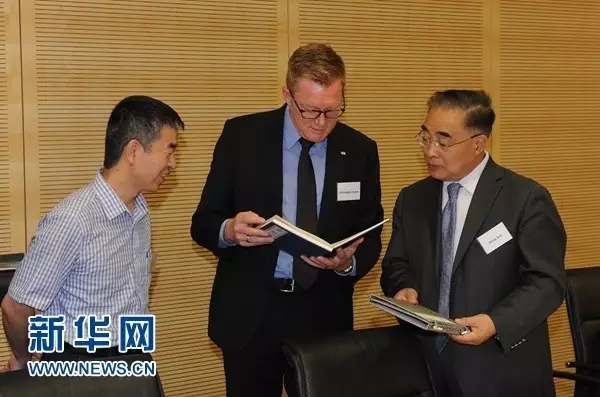 中國中醫(yī)科學院院長張伯禮(右)與漢諾威醫(yī)科大學校長克里斯托弗·鮑姆(中)交談