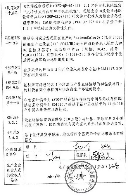 吉林瑞爾康隱形眼鏡有限公司現(xiàn)場檢查缺陷表