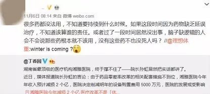 同年,湖南 「湘雅系」要求藥企支付藥房運(yùn)轉(zhuǎn)成本,為達(dá)到目的拒付藥款,引發(fā)巨大的輿論震動(dòng),最終發(fā)展為湘雅醫(yī)院 2016 年 11 月上旬的「哭窮」新聞發(fā)布會(huì)。