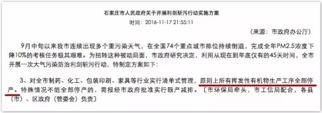 11月17日,石家莊市人民政府下發(fā)《關(guān)于開展利劍斬污行動(dòng)實(shí)施方案》,文件要求從2016年11月17日到2016年12月31日,關(guān)停大批重污染企業(yè),對(duì)制藥企業(yè)實(shí)行清單式管理,原則上所有揮發(fā)性有機(jī)物生產(chǎn)工序全部停產(chǎn),特殊情況不能全部停產(chǎn)的,需報(bào)經(jīng)市政府批準(zhǔn)實(shí)行限產(chǎn)減排。