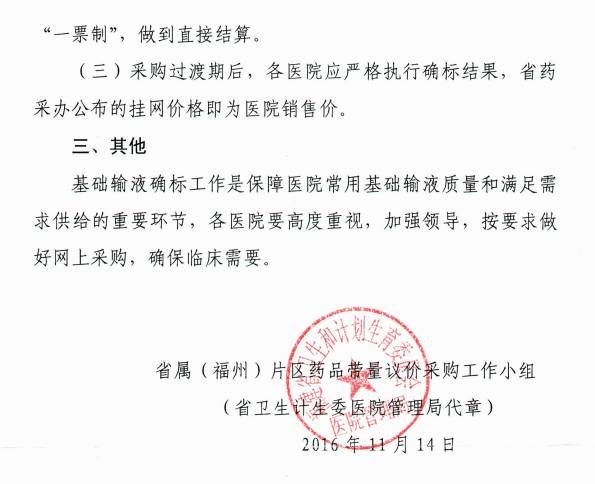 近日,有業(yè)內(nèi)人士向賽柏藍(lán)反映,一份福建省衛(wèi)計(jì)委醫(yī)院管理局戳紅章,名為《關(guān)于省屬公立醫(yī)院基礎(chǔ)輸液確標(biāo)的通知》的內(nèi)部文件,直接下發(fā)到醫(yī)院,文件明確要求醫(yī)院根據(jù)第一、二批基礎(chǔ)輸液限價(jià)掛網(wǎng)結(jié)果進(jìn)行選擇采購,醫(yī)院和藥品生產(chǎn)企業(yè)直接結(jié)算,嚴(yán)格執(zhí)行“一票制”。
