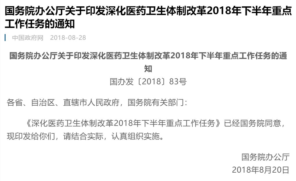 昨日(8月28日),國務(wù)院辦公廳發(fā)布《深化醫(yī)藥衛(wèi)生體制改革2018年下半年重點工作任務(wù)的通知》。