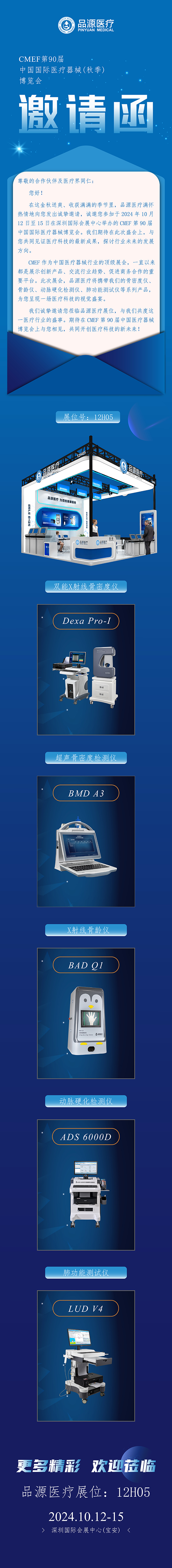 CMEF 作為中國醫(yī)療器械行業(yè)的頂級(jí)展會(huì),一直以來都是展示創(chuàng)新產(chǎn)品、交流行業(yè)趨勢(shì)、促進(jìn)商務(wù)合作的重要平臺(tái)。此次展會(huì),品源醫(yī)療將攜帶我們的骨密度儀、骨齡儀、動(dòng)脈硬化檢測(cè)儀、肺功能測(cè)試儀等系列產(chǎn)品,為您呈現(xiàn)一場(chǎng)醫(yī)療科技的視覺盛宴。我們誠摯邀請(qǐng)您蒞臨品源醫(yī)療展位12H05,與我們共度這一醫(yī)療行業(yè)的盛事。期待在 CMEF 第 90 屆中國醫(yī)療器械博覽會(huì)上與您相見,共同開創(chuàng)醫(yī)療科技的新未來!