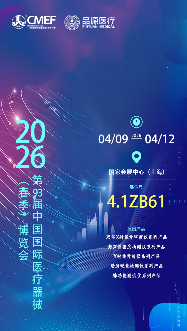 時隔一年,品源醫(yī)療再度赴約這場醫(yī)械行業(yè)盛會,屆時將攜雙能X射線骨密度儀、超聲骨密度檢測儀、X射線骨齡儀、動脈硬化檢測儀、肺功能測試儀五大核心系列產(chǎn)品參展,全方位展示品牌在健康檢測、慢病篩查、生長發(fā)育評估等領(lǐng)域的技術(shù)積淀與產(chǎn)品實力,與行業(yè)同仁共話醫(yī)療發(fā)展新機遇。