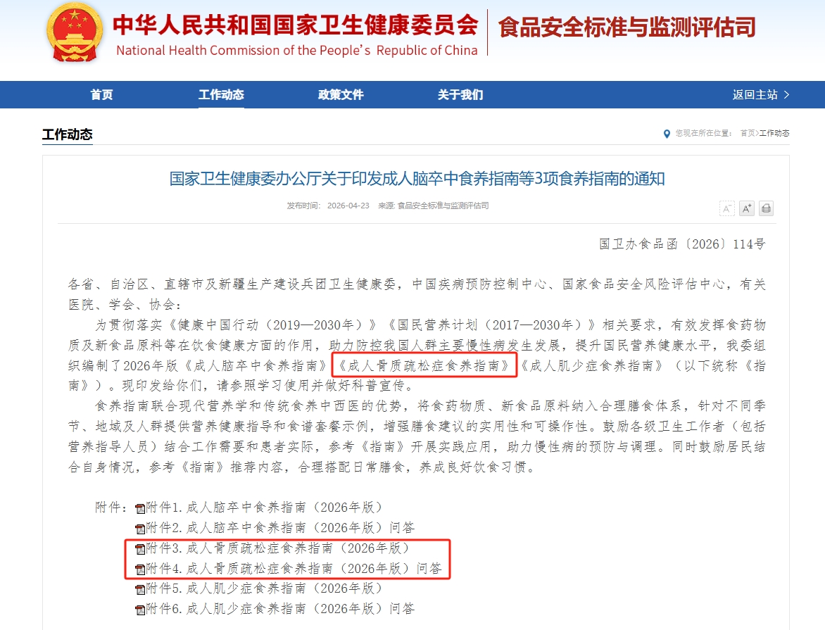為貫徹落實(shí)《健康中國行動(2019—2030年)》《國民營養(yǎng)計(jì)劃(2017—2030年)》相關(guān)要求,有效發(fā)揮食藥物質(zhì)及新食品原料等在飲食健康方面的作用,助力防控我國人群主要慢性病發(fā)生發(fā)展,提升國民營養(yǎng)健康水平,2026年4月23日,國家衛(wèi)生健康委辦公廳印發(fā)通知,正式發(fā)布《成人腦卒中食養(yǎng)指南(2026年版)》《成人骨質(zhì)疏松癥食養(yǎng)指南(2026年版)》《成人肌少癥食養(yǎng)指南(2026年版)》3項(xiàng)成人專項(xiàng)食養(yǎng)指南。
