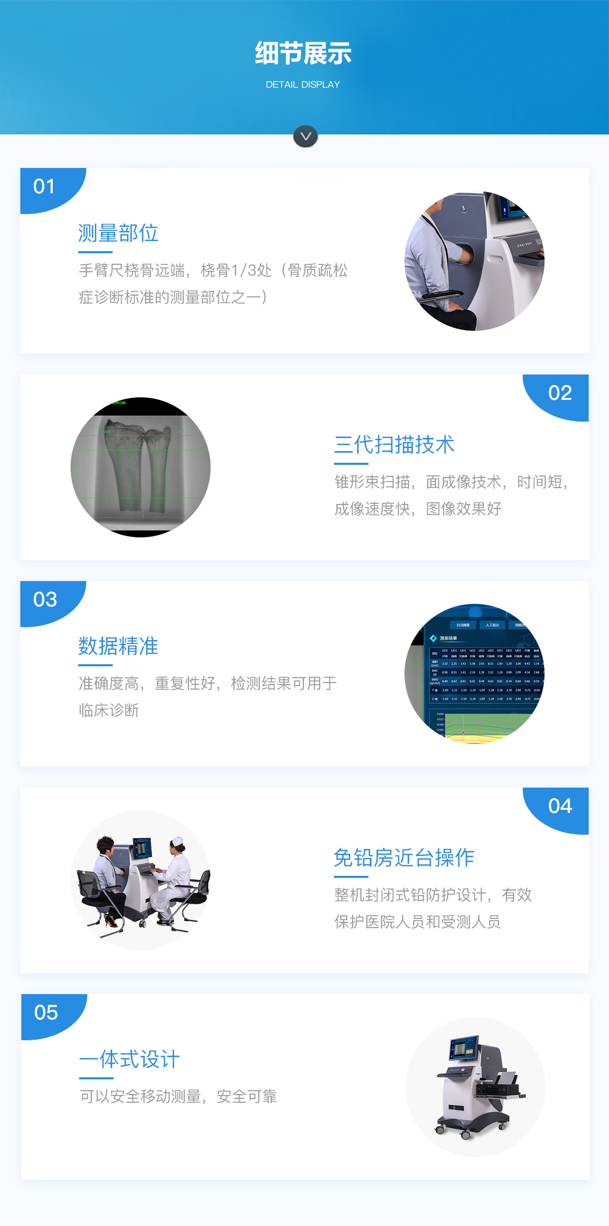 DXA- 800F 雙能X線骨密度檢測儀測量手臂前段,這些部位易顯露,操作簡捷,無需消毒。測量速度快,方便醫(yī)生及病人,可用于大人群檢測。